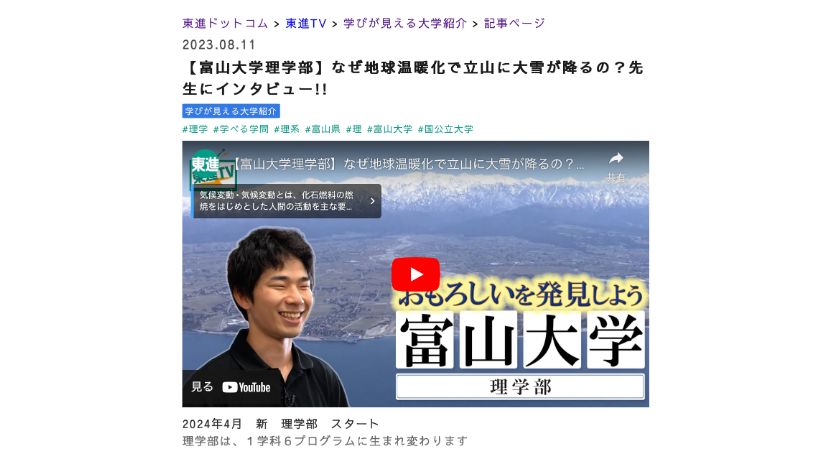 東進ドットコム 東進TV 学びが見える大学紹介:富山大学理学部(2023.08)東進ハイスクールの東進TV学びが見える大学紹介のコーナで、富山大学理学部がが紹介されています。テーマは、「富山から自然を学び、地球の謎を解き明かす」です。高校生のみなさん、富山大学理学部では、富山の自然を研究しながら、地球規模の環境問題に取り組み、地球の未来に貢献しています。是非、ご覧ください。いつ見るの、いまでしょう! |