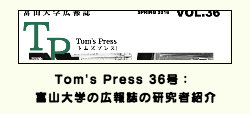 富山大学広報誌 トムズプレス Vol. 36(2016.03.15発行)富山大学広報誌「トムズプレス」の研究者紹介に私(青木)が登場しています。読んで頂ければ幸いです。 |