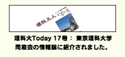 理科大 today No. 17(2014.08.15発行)母校である東京理科大学の広報誌、理科大 today No.17の「活躍する卒業生⑬:理科大人いろいろ」で、私(青木)が紹介されました。楽しかった神楽坂での学生時代を思い出すばかりです。 |