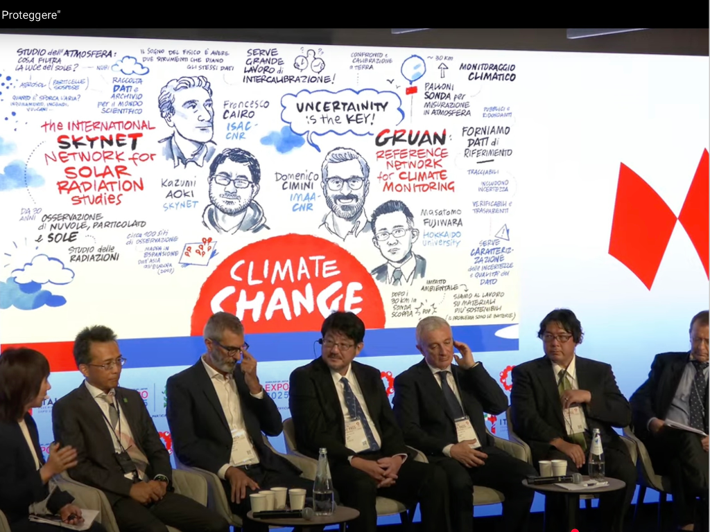 2025年9月19日、大阪・関西万博2025のイタリア館で、イタリア国立研究評議会(CNR)の地球システム科学・環境技術部門(DSSTTA)が主催したイベント「Conoscere per proteggere – Knowledge as the key to protection(守るために知る)」に参加・発表してきました。生物多様性、海洋、極域、気候変動、自然災害という5つの環境テーマについて、日伊の専門家が集まり知見を共有しました。私とCNRのCairoさんとで「気候変動」の前半を担当し、30年以上の日伊はもちろん国際的な太陽放射観測ネットワークについて、「記憶 としての知識」をキーワードに、環境変化への理解と、地球規模の課題に対するレジリエンス の向上に向けた科学的対話を展開してきました。朝から夕方までイタリア館に缶詰だったので、博覧会の様子は良くわかりませんでしたが、とにかく、地下鉄から始まり博覧会場内の人の多さにびっくりでした。このようなイベントで、我々の研究を紹介する機会を頂き関係各位に感謝しております。みなさま、今後ともよろしくお願いします。