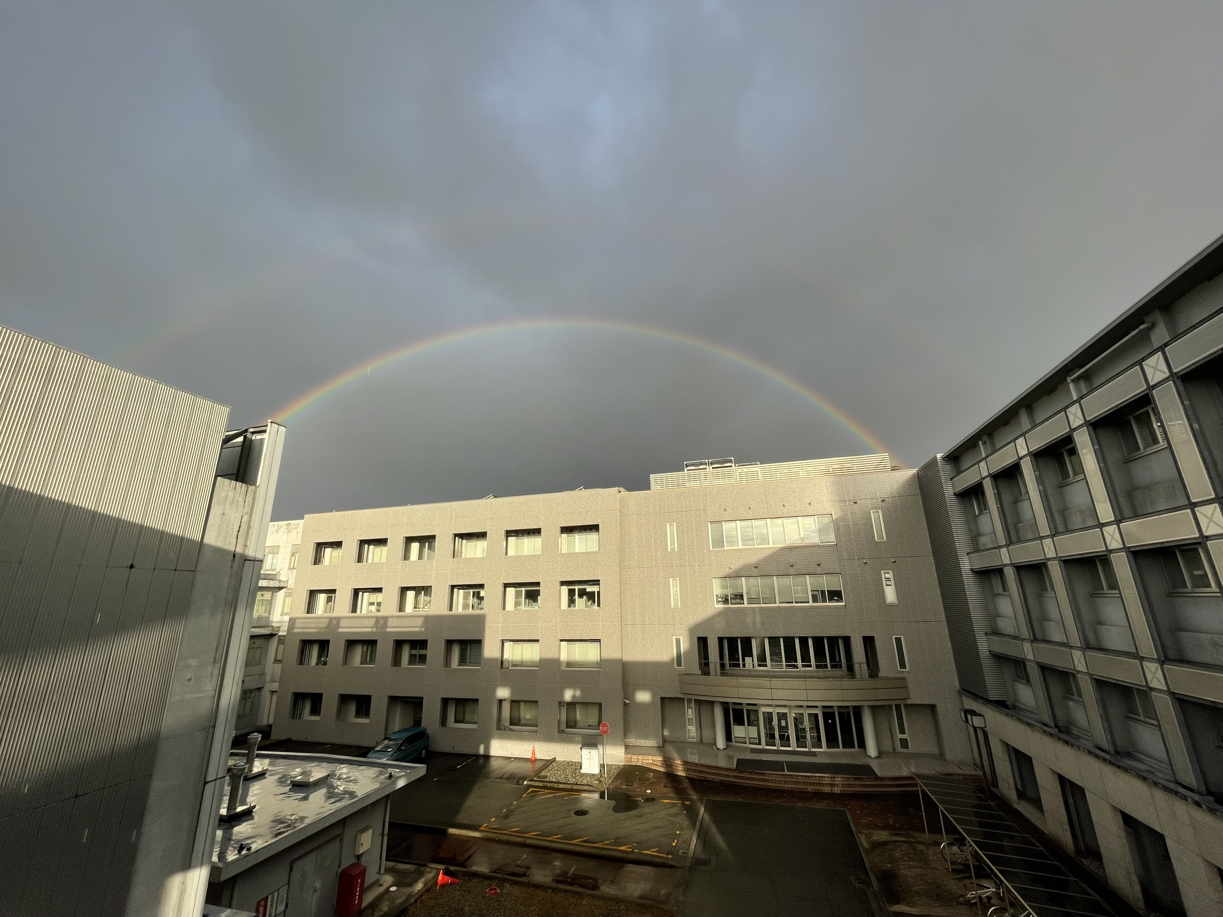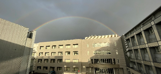 今年はハイブリット開催でしたが、多くの参加者がオスロに集まりました。昨年はオンライン開催となり残念でしたが、2019年9月のバルセロナ以来の対面形式の開催となり、やはり対面がいいです。日本からは私のみでしたが、懐かしい顔に会えたのはもちろん、オンラインだとなかなか話しづらい内容も出来て、参加出来て本当によかったです。多くの議論から、滞っていた研究も進みそうですし、多くの宿題を持ち帰ることが出来そうです。いつもながら、北欧のスタイリッシュな会場で、こんな職場環境で働きたいと思うのは、私だけでしょうか。夕方、会議後に談笑していたら、きれいな虹(主虹・副虹)がでているとのこと。みんなで外に出て見た虹と夕日が印象的でした。ところで、10日は祝日?。今日は休日出勤。。。