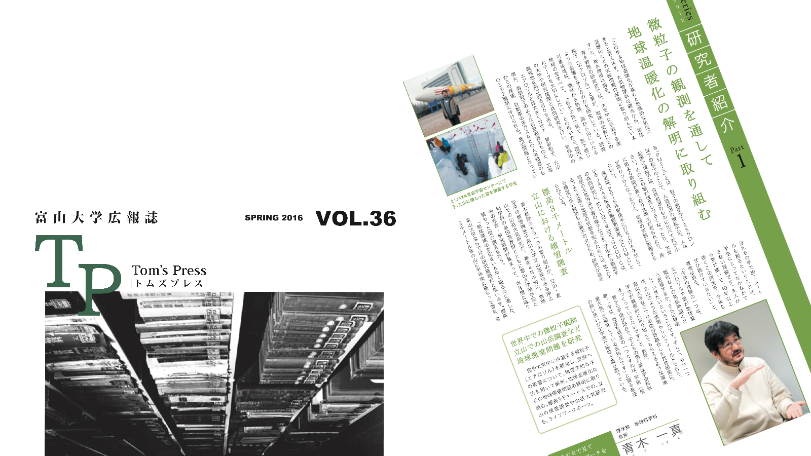 富山大学広報誌 トムズプレス Vol. 36(2016.03.15発行)富山大学広報誌「トムズプレス」の研究者紹介に私(青木)が登場しています。読んで頂ければ幸いです。 |