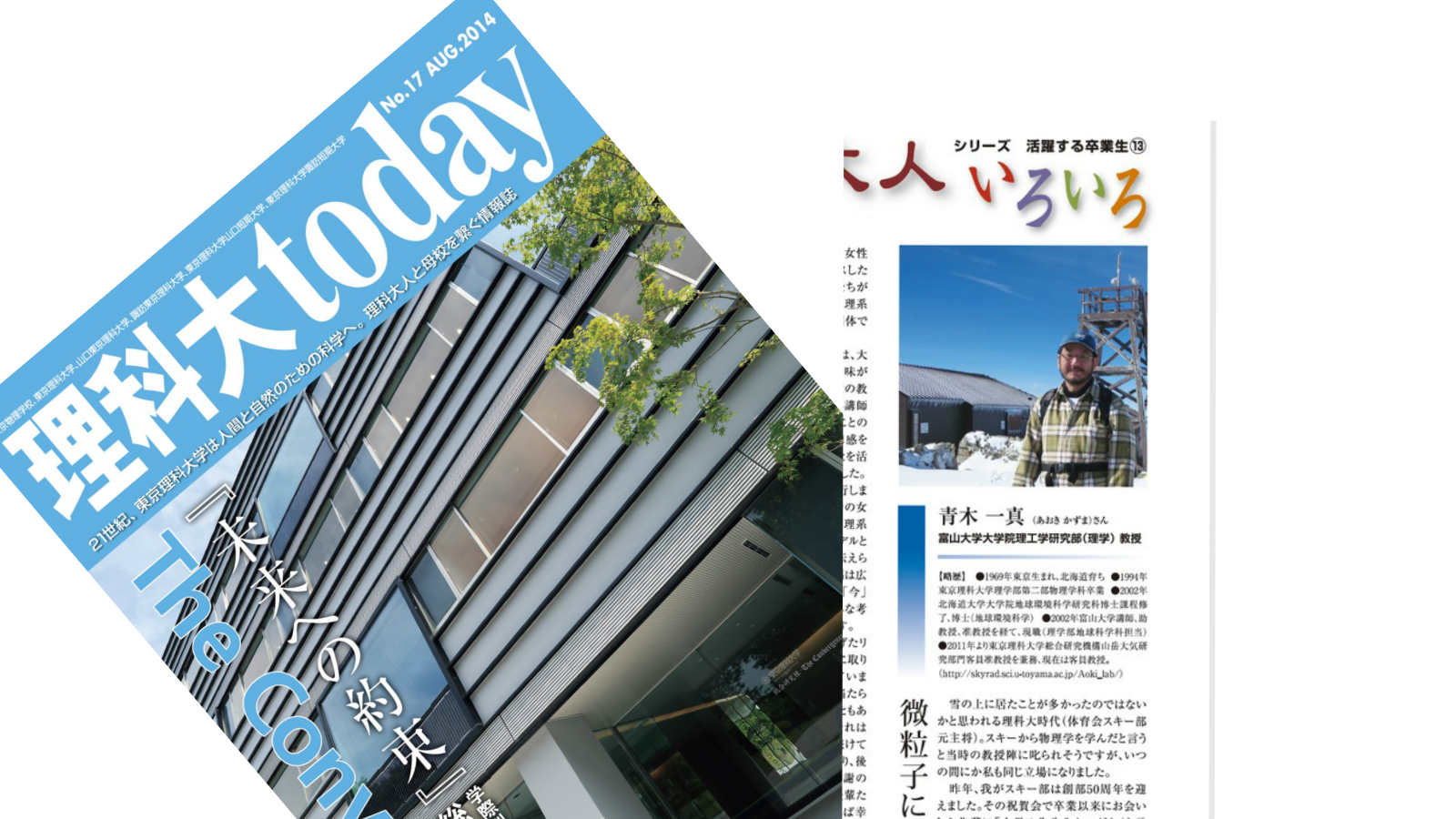 理科大 today No. 17(2014.08.15発行)母校である東京理科大学の広報誌、理科大 today No.17の「活躍する卒業生⑬:理科大人いろいろ」で、私(青木)が紹介されました。楽しかった神楽坂での学生時代を思い出すばかりです。 |