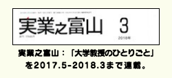 実業之富山「大学教授のひとりごと」(2017.05 - 2018.03連載)2017年5月から2018年3月まで、実業之富山で、「大学教授のひとりごと」を毎月連載していました。普段、横書き原稿しか書かない私に、縦書き原稿は新鮮でした。物を書く事や紙媒体の紙面の重要性を再確認しました。貴重な経験ありがとうございました。現在、実業之富山は、残念ながら休刊になっていますが、下記のウェブ版として情報発信されています。 |