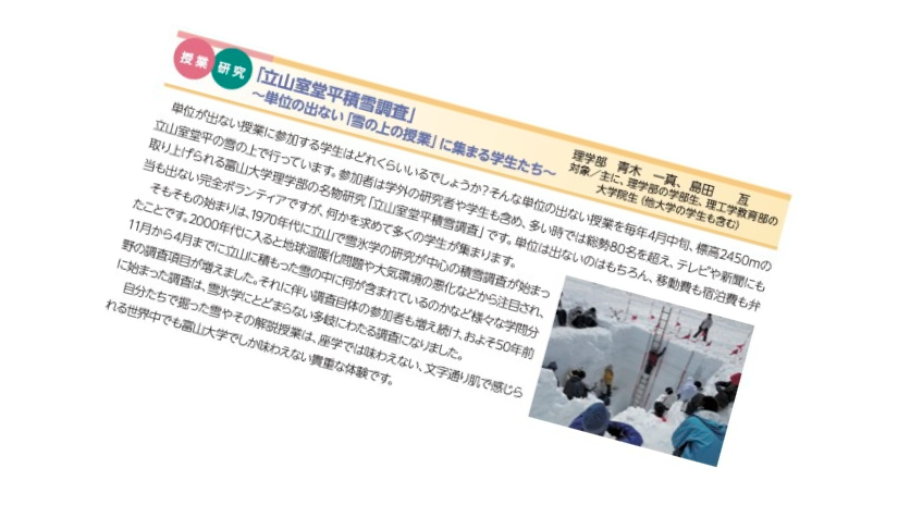 富山大学 News Letter 2021夏号(2021.07)富山大学 News Letter 2021夏号に、積雪調査が紹介されました。これは、富山大学のウェブ「未来を拓く:おもしろい授業・おもしろい研究」で紹介されたものが、Pick Up!として選ばれて紹介されました。 |