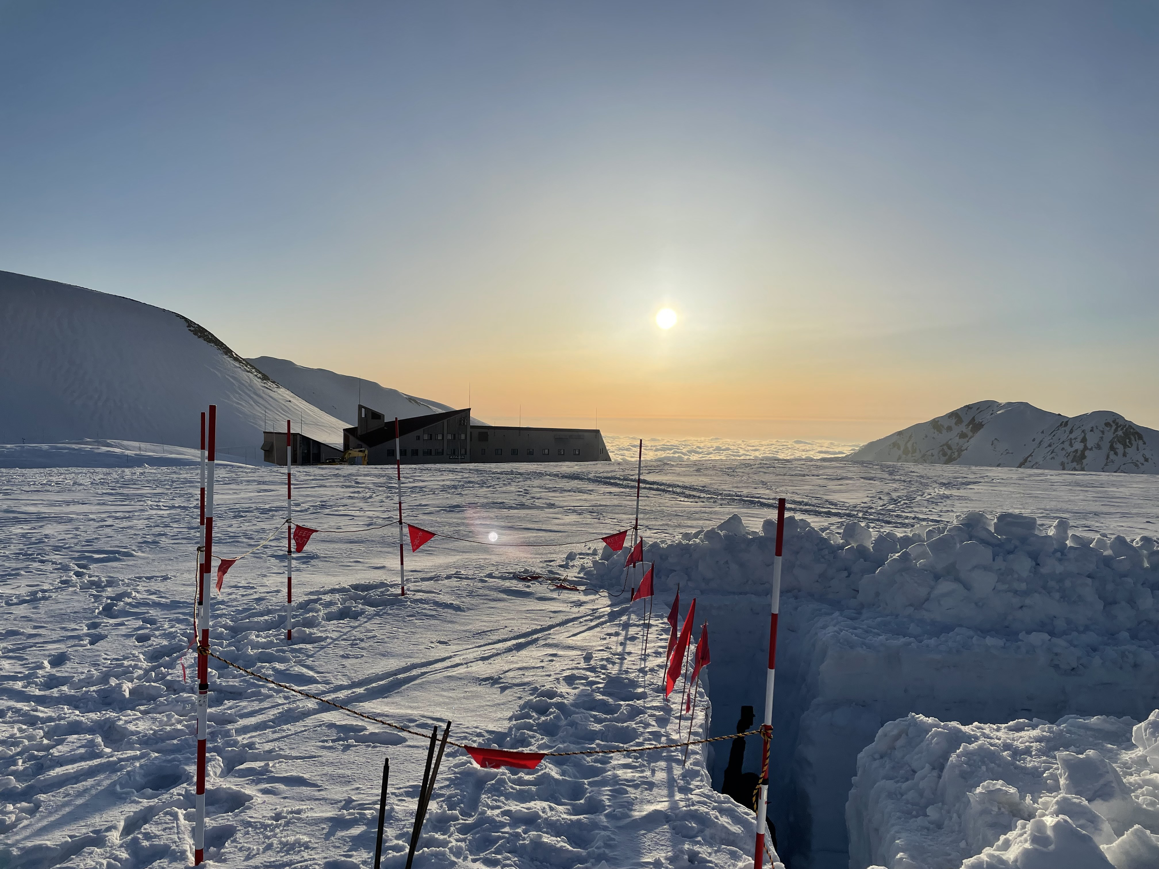 タイミングが良ければ羽田発のANA富山便の左側の窓席(*A)から写真のように立山黒部アルペンルートを見ることが出来ます。雲がかかっていることが多いので空撮は難しいですが、時々、このような写真が撮れます。約1ヶ月前(2022.04.16 - 2022.04.18の記事)に標高2450mの立山・室堂平で615cmもの雪を掘っていたのが不思議な感じに思います。写真には、室堂ターミナルや積雪調査(室堂平)の場所や富山大学立山施設(浄土山)が写っていますが、わかりますか? まだ、立山施設は1/3ぐらい雪に埋まっています。まだまだ立山は雪がありますので、富山県山岳遭難対策協議会のメンバーのひとりとしても、みなさまには山岳事故のないように、立山で楽しんで頂けたら幸いです。