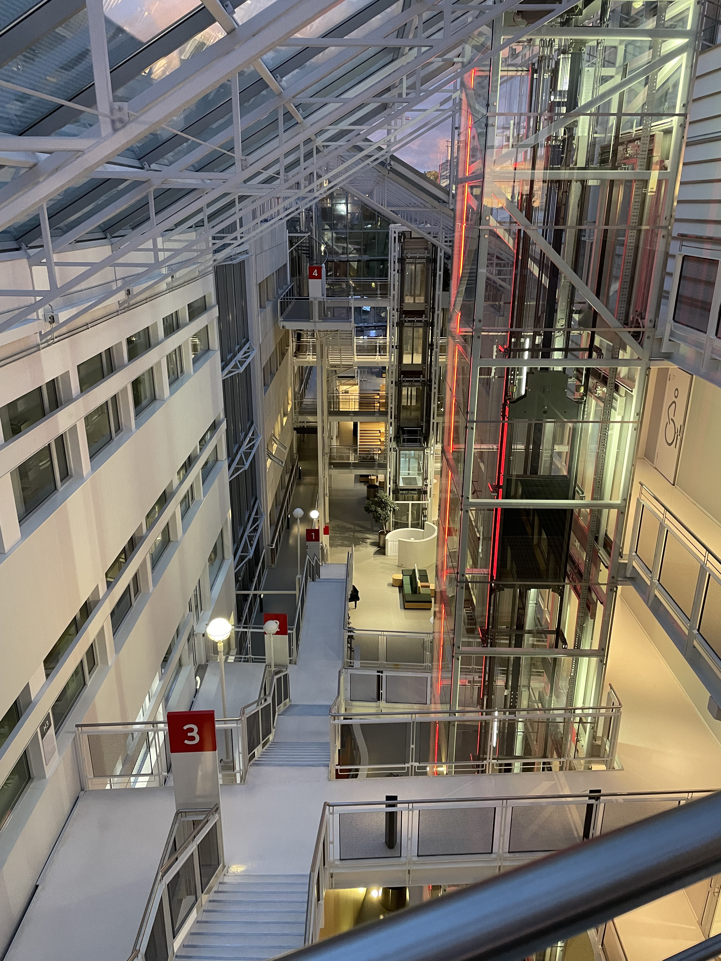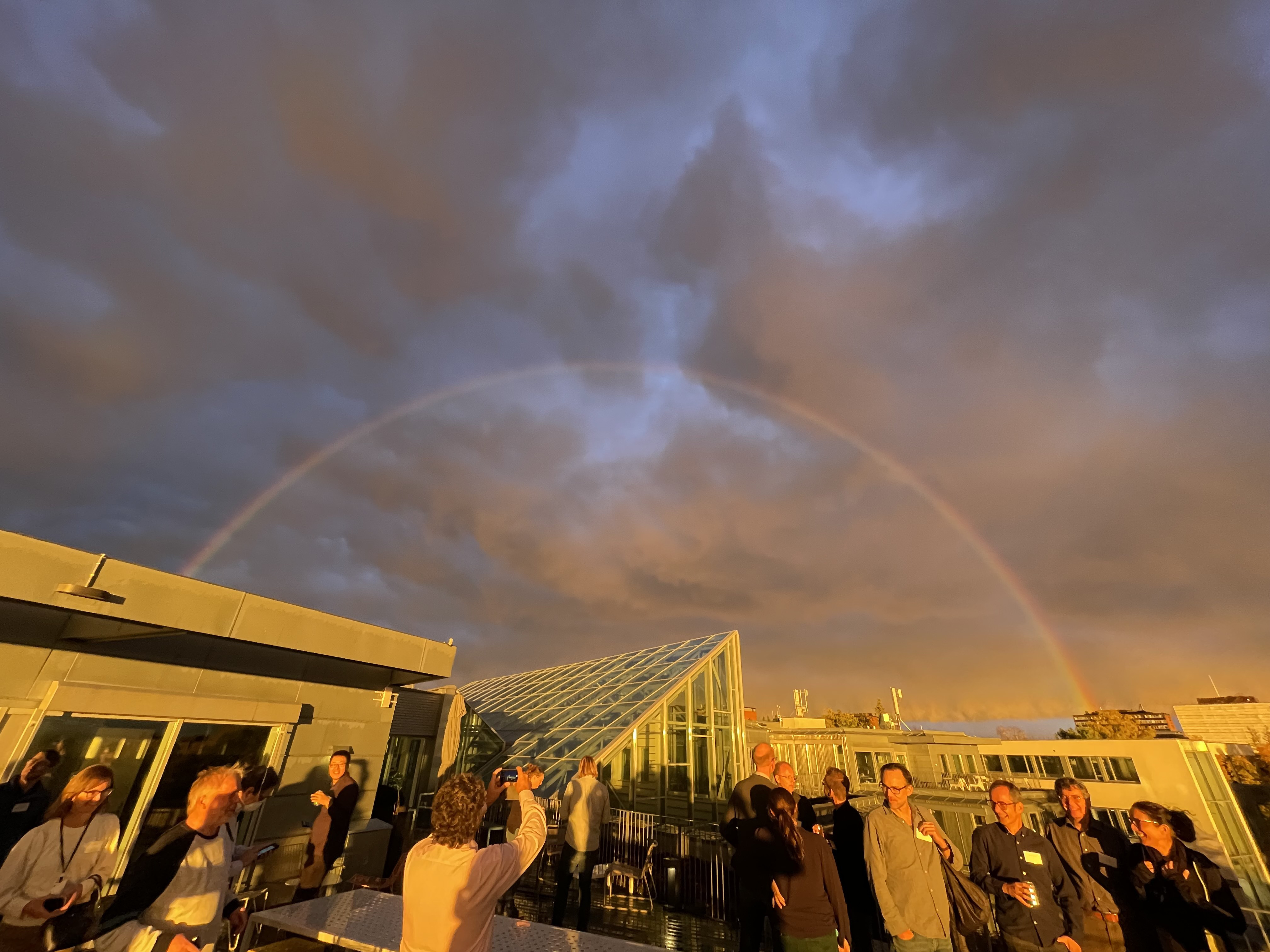 今年はハイブリット開催でしたが、多くの参加者がオスロに集まりました。昨年はオンライン開催となり残念でしたが、2019年9月のバルセロナ以来の対面形式の開催となり、やはり対面がいいです。日本からは私のみでしたが、懐かしい顔に会えたのはもちろん、オンラインだとなかなか話しづらい内容も出来て、参加出来て本当によかったです。多くの議論から、滞っていた研究も進みそうですし、多くの宿題を持ち帰ることが出来そうです。いつもながら、北欧のスタイリッシュな会場で、こんな職場環境で働きたいと思うのは、私だけでしょうか。夕方、会議後に談笑していたら、きれいな虹(主虹・副虹)がでているとのこと。みんなで外に出て見た虹と夕日が印象的でした。ところで、10日は祝日?。今日は休日出勤。。。