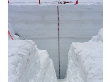 この積雪断面調査は、毎年、立山・黒部アルペンルートが全線開通する4月中旬に、富山大学が中心(立山積雪研究会)に様々な教育・研究機関が集まり、半年間、立山に降り積もった雪の調査を行っています。