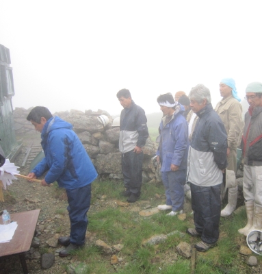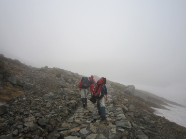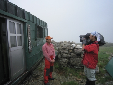 改修工事当日、霧の中登る私たち(島田准教授、青木准教授(私)、NHK富山放送局ニュースカメラマン2名)。NHKの方々、重いカメラを背負って、わざわざ取材頂きありがとうございました。