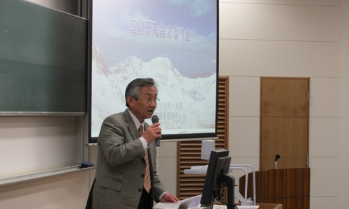- 師走のお忙しいところ、全国から40名もの方々にご参加頂きありがとうございました。本研究会は、大気、雪氷、植生など、立山のフィールド研究が大好きな研究者にお集まり頂いております。今回は、立山研究のエキスパートの名古屋大の長田先生やそらなっとうの開発者の金沢大の牧先生など、立山にまつわる楽しい研究のお話しをして頂きました。このような研究を楽しんでいる姿を学生に伝え、次の世代の研究者が育ってくれればと願うばかりです。牧先生から、参加者のみなさんにちょっと早めのクリスマスプレゼント?も配られました。みなさんに次にお会いするのは、4月の立山積雪調査でしょうか。みなさま、おつかれさまでした。
