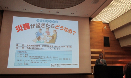 - 富山大学と文部科学省が主催の熟議2012 in 富山大学「災害が起きたらどうする?」が行われました。私は、ファシリテーターとして参加させて頂きましたが、D班の参加者のみなさま、慣れない進行にも関わらず、活発な熟議をして頂きありがとうございました。実際に災害が起こったときのいろいろな立場での行動や富山ならではのご意見など、長い時間でしたが有意義な熟議が出来たのではないかと思います。特に、町内会・自治会活動をされている方、本当にごくろうさまです。