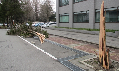 - 全国各地に大きな被害を出した低気圧、富山県では、砺波で最大瞬間風速 39.8m/s (南南東:14:33, JMA)、富山で最大瞬間風速 31.3 m/s (南南西:13:09, JMA)でした。上の写真のように富山大学構内でも木が折れたり、窓ガラスが割れたり等の被害が出ました。地震に限らず、自然災害による被害が多く感じられる昨今、正しい知識と的確な行動力が重要となってくる時代ですね。