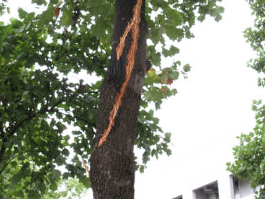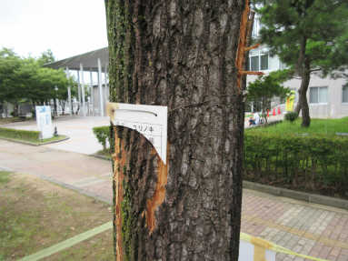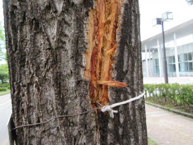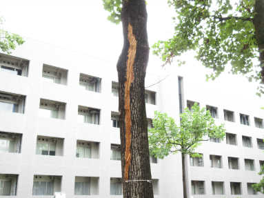 「今年の夏は」と、毎年のように言っていて、今年も猛暑や豪雨の被害が出ているので、気象災害が頻発する昨今。北陸と言えば冬の雷が有名ですが、8月22日(2017年)の午後、富山大学五福キャンパスの理学部と学生会館の間のメインストリートのユリノキに落雷。まずは、学生をはじめ、人的被害がなかったことは、不幸中の幸いだったと思います。みなさま、雷が鳴っている時は、いくら街中だとは言っても、安全な場所に避難して下さい。先日の、「学長と立山登ろう」も雷雨で登山を途中で中止にしましたが、今年の夏は当たり年? 今回の落雷は、22日の午後1時過ぎ、頻発した落雷のひとつです。下の北陸電力(JWAの発雷状況)を見て頂ければ発雷状況がわかると思います。ただ、まわりに校舎があり、避雷針もあるので、何故、この木に落ちたのかは疑問です。。。基本は、高いものに落ちるので。以下、写真で説明します。