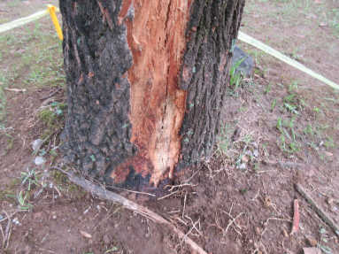 ① 木に落雷の跡があるのは、赤い矢印の木です。多分(もしかすると)、隣の木の方が高くて隣接しているので、左側に落ちて、右側に移動したのではないかと思います。